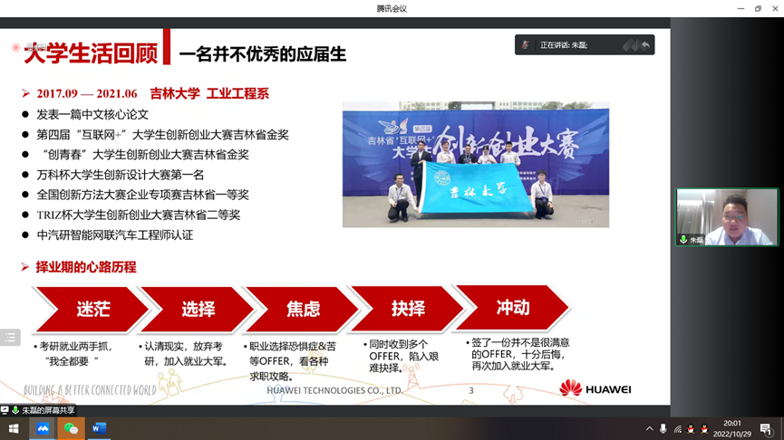 为实现学院研究生就业工作有用有效,贴近贴实,分层分众的工作目标,拓宽学生就业思维,丰富学生就业路径,提升学生就业技能。10月29日,必赢线路检测中心与华为技术有限公司吉林代表处在云端开展了2023届华为校招就业专场分享会。华为吉林人力资源部部长胡光,华为中国地区校招负责人段彩云,华为内蒙古代表处运营商客户经理黄钰、华为辽宁代表处政企客户经理朱磊参加了本次分享会,会议由学院党委副书记马旭主持。
