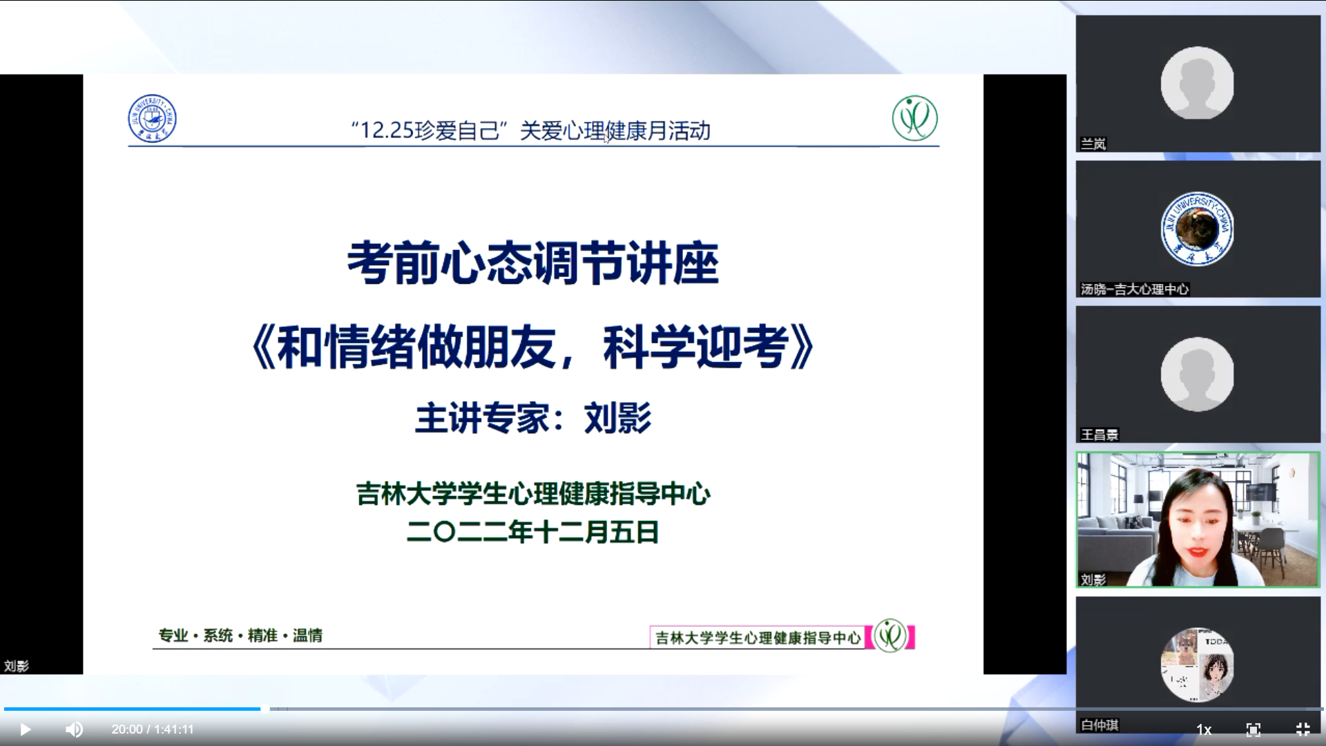 为帮助研究生提升心理健康素质,缓解科研、就业等心理压力,调节情绪,调整心态,规划生活。12月5日,学院组织全体研究生以线上直播+录播的方式观看学习吉林大学学生心理健康指导中心开展的考研求职心理调适讲座和考前心态调节讲座。