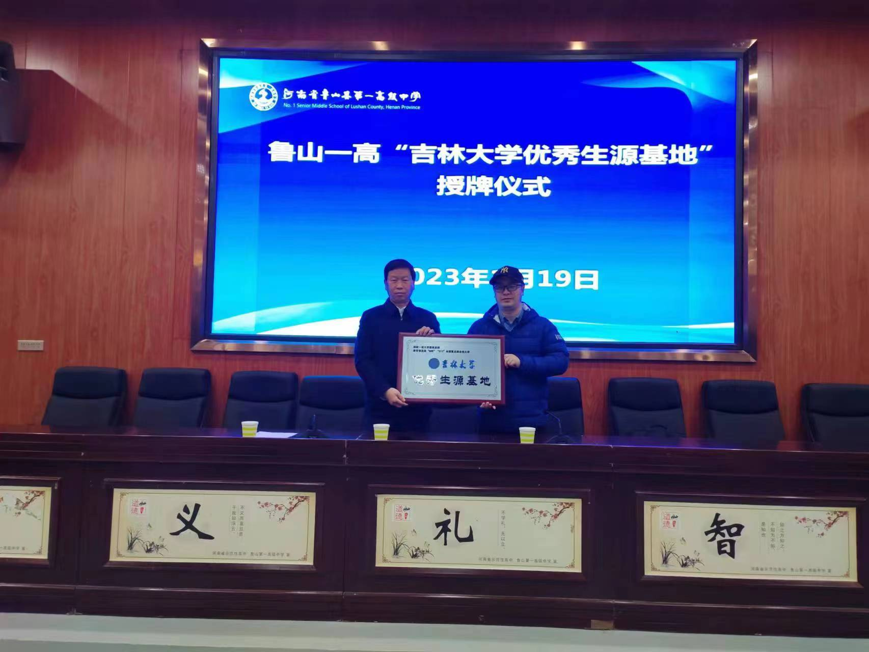 2023年1月19日上午,必赢线路检测中心学生工作办公室主任杨凯凯按照学院招生宣传工作统一部署,前往河南省鲁山县第一高级中学,举行吉林大学优秀生源基地授牌仪式。鲁山一高党委书记、校长牛山坡、鲁山一高副校长孙明远参加了此次仪式。