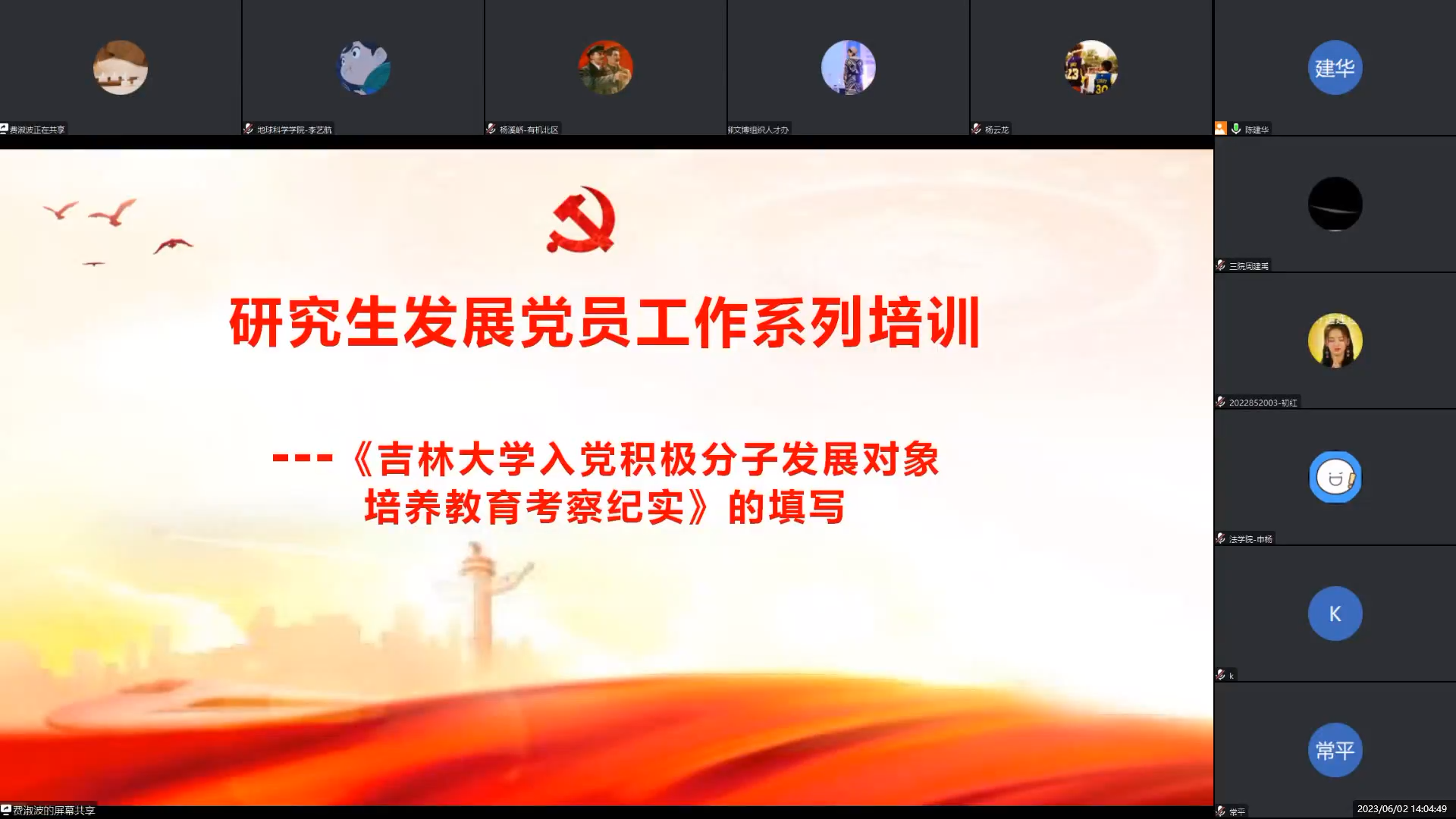 培训主讲老师陈建华以《吉林大学入党积极分子 发展对象培养教育考察纪实》的填写为例,详细介绍了确定入党积极分子、发展对象等工作的流程及材料填写的原则、内容和注意事项,她强调必须本着对同学负责、对党组织负责的态度确保发展党员工作流程严谨、材料填写规范,严把标准和程序关,高质量做好发展党员工作。