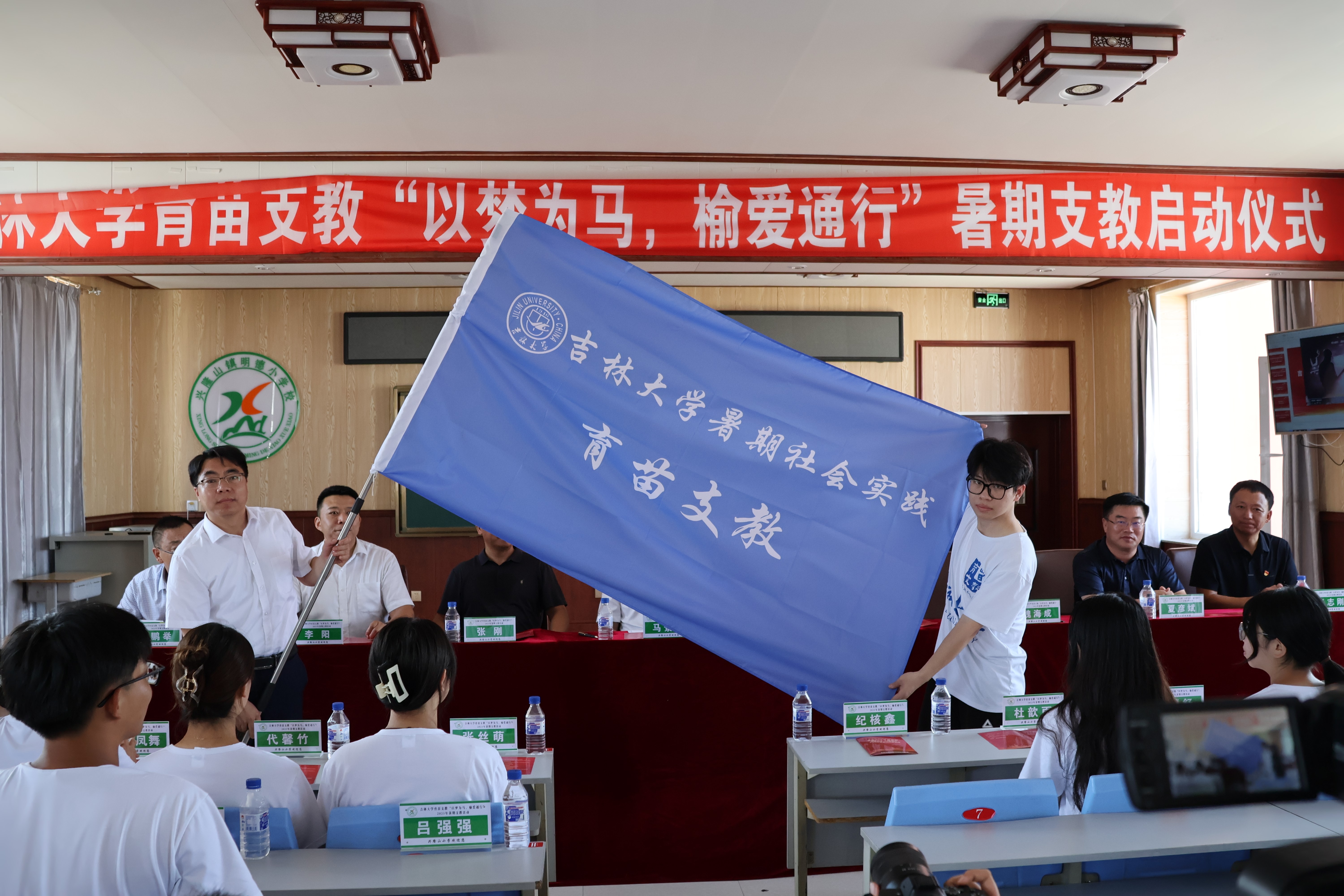 魏海成副书记向支教队队长吕强强进行“吉林大学育苗支教社团暑期社会实践”授旗