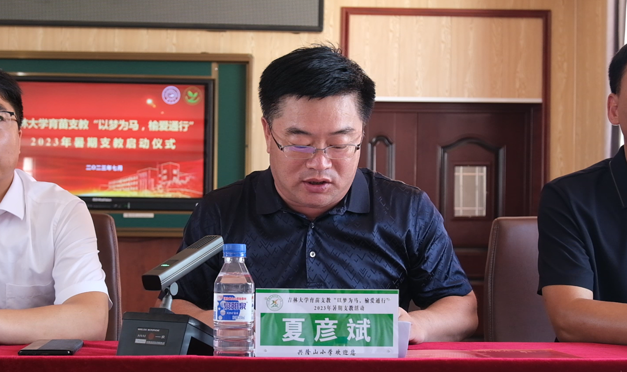 仪式上,通榆县兴隆山镇党委书记夏彦斌致欢迎词。他对吉林大学育苗支教社团的到来表示热烈欢迎,并对乡村振兴以来吉林大学对兴隆山镇教育方面的帮扶表示衷心的感谢。他希望育苗支教社团此次支教能够助力兴隆山镇教育事业再上新台阶,也希望与吉林大学的合作继续深入,共同努力创造乡村振兴新局面。