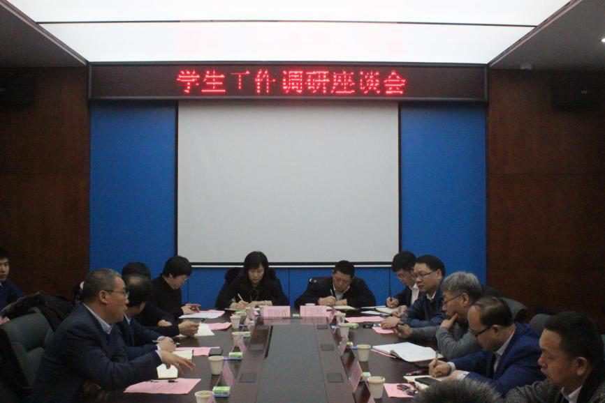 2018年12月20日下午,校党委副书记冯正玉,校党委办公室、学生工作部、研究生工作部、教务处、校团委、学生就业创业指导与服务中心、保卫处、学生心理健康指导中心等单位相关负责同志一行来到我院,开展学生工作专题调研。我院党委书记杨洲,院长任云生,党委副书记刘晓鹏以及学生工作办公室、研究生办公室的工作人员和学生代表参与了此次调研。